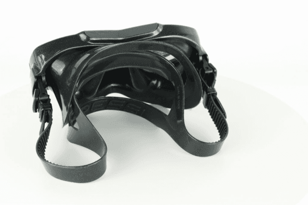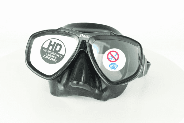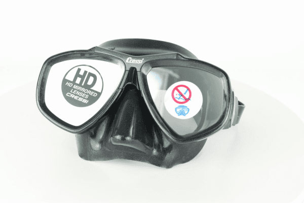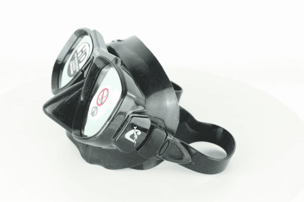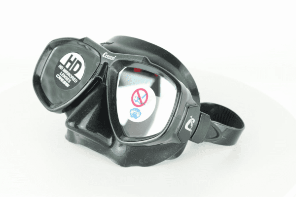 One of the first dive mask with inclined glasses, a patented technology of Cressi (US6272693).